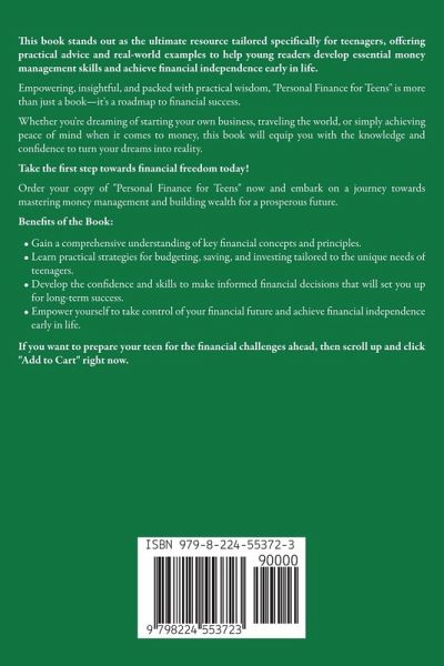 This book stands out as the ultimate resource tailored specifically for teenagers, offering practical advice and real-world examples to help young readers develop essential money management skills and achieve financial independence early in life. Empowering, insightful, and packed with practical wisdom, "Personal Finance for Teens" is more than just a book-it's a roadmap to financial success. Whether you're dreaming of starting your own business, traveling the world, or simply achieving peace of mind when it comes to money, this book will equip you with the knowledge and confidence to turn your dreams into reality. Take the first step towards financial freedom today! Order your copy of "Personal Finance for Teens" now and embark on a journey towards mastering money management and building wealth for a prosperous future. Benefits of the Book: Gain a comprehensive understanding of key financial concepts and principles. Learn practical strategies for budgeting, saving, and investing tailored to the unique needs of teenagers. Develop the confidence and skills to make informed financial decisions that will set you up for long-term success. Empower yourself to take control of your financial future and achieve financial independence early in life. If you want to prepare your teen for the financial challenges ahead, then scroll up and click "Add to Cart" right now.