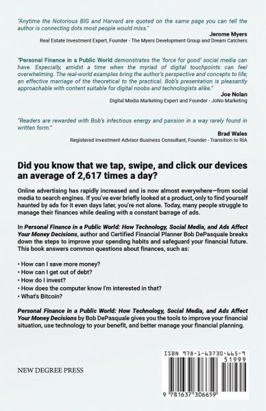 Did you know that we tap, swipe, and click our devices an average of 2,617 times a day? Online advertising has rapidly increased and is now almost everywhere-from social media to search engines. If you've ever briefly looked at a product, only to find yourself haunted by ads for it even days later, you're not alone. Today, many people struggle to manage their finances while dealing with a constant barrage of ads. In Personal Finance in a Public World: How Technology, Social Media, and Ads Affect Your Money Decisions, author and Certified Financial Planner Bob DePasquale breaks down the steps to improve your spending habits and safeguard your financial future. This book answers common questions about finances, such as: How can I save more money? How can I get out of debt? How do I invest? How does the computer know I'm interested in that? What's Bitcoin? Personal Finance in a Public World: How Technology, Social Media, and Ads Affect Your Money Decisions by Bob DePasquale gives you the tools to improve your financial situation, use technology to your benefit, and better manage your financial planning.