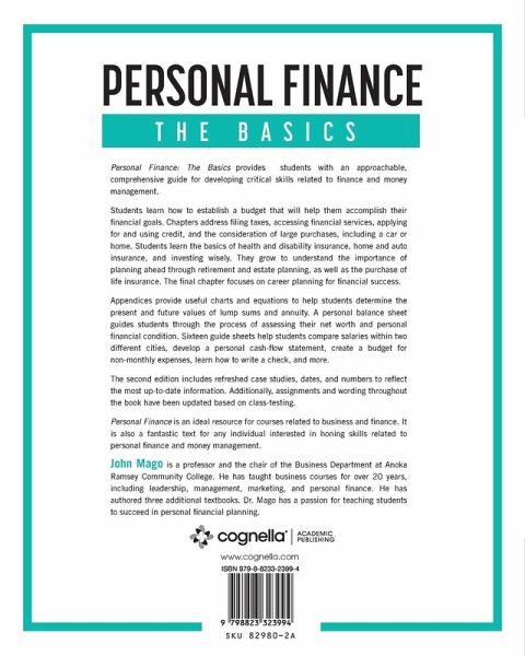 Personal Finance: The Basics provides students with an approachable, comprehensive guide for developing critical skills related to finance and money management. Students learn how to establish a budget that will help them accomplish their financial goals. Chapters address filing taxes, accessing financial services, applying for and using credit, and the consideration of large purchases, including a car or home. Students learn the basics of health and disability insurance, home and auto insurance, and investing wisely. They grow to understand the importance of planning ahead through retirement and estate planning, as well as the purchase of life insurance. The final chapter focuses on career planning for financial success. ,br> Appendices provide useful charts and equations to help students determine the present and future values of lump sums and annuity. A personal balance sheet guides students through the process of assessing their net worth and personal financial condition. Sixteen guide sheets help students compare salaries within two different cities, develop a personal cash-flow statement, create a budget for non-monthly expenses, learn how to write a check, and more. The second edition includes refreshed case studies, dates, and numbers to reflect the most up-to-date information. Additionally, assignments and wording throughout the book have been updated based on class-testing. Personal Finance is an ideal resource for courses related to business and finance. It is also a fantastic text for any individual interested in honing skills related to personal finance and money management.