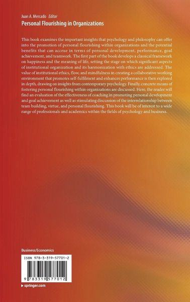 This book examines the important insights that psychology and philosophy can offer into the promotion of personal flourishing within organizations and the potential benefits that can accrue in terms of personal development, performance, goal achievement, and teamwork. The first part of the book develops a classical framework on happiness and the meaning of life, setting the stage on which significant aspects of institutional organization and its harmonization with ethics are addressed. The value of institutional ethics, flow, and mindfulness in creating a collaborative working environment that promotes self-fulfilment and enhances performance is then explored in depth, drawing on insights from contemporary psychology. Finally, concrete means of fostering personal flourishing within organizations are discussed. Here, the reader will find an evaluation of the effectiveness of coaching in promoting personal development and goal achievement as well as stimulating discussion of the interrelationship between team building, virtue, and personal flourishing. This book will be of interest to a wide range of professionals and academics within the fields of psychology and business.