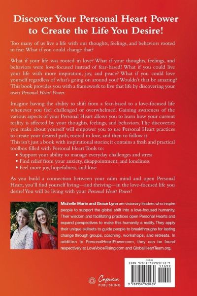 Discover your own Personal Heart Power to create the life you desire! Too many of us live a life with our thoughts, feelings, and behaviors rooted in fear. What if you could change that? What if your life was rooted in love? What if your thoughts, feelings, and behaviors were love-focused instead of fear-based? What if you could live your life with more inspiration, joy, and peace? What if you could love yourself regardless of what's going on around you? Wouldn't that be amazing? This book provides you with a framework to live that life by discovering your own Personal Heart Power. Imagine having the ability to shift from a fear-based to a love-focused life whenever you feel challenged or overwhelmed. Gaining awareness of the various aspects of your Personal Heart allows you to learn how your current reality is affected by your thoughts, feelings, and behaviors. The discoveries you make about yourself will empower you to use Personal Heart practices to create your desired path, rooted in love, and then to follow it. This isn't just a book with inspirational stories; it contains a fresh and practical toolbox filled with Personal Heart Tools to: ¿ Support your ability to manage everyday challenges and stress ¿ Find relief from your anxiety, disappointment, and loneliness ¿¿Feel more joy, hopefulness, and love As you build a connection between your calm mind and open Personal Heart, you'll find yourself living-and thriving-in the love-focused life you desire! You will be living with your Personal Heart Power!