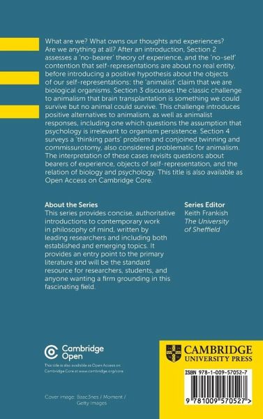 What are we? What owns our thoughts and experiences? Are we anything at all? After an introduction, Section 2 assesses a 'no-bearer' theory of experience, and the 'no-self' contention that self-representations are about no real entity, before introducing a positive hypothesis about the objects of our self-representations: the 'animalist' claim that we are biological organisms. Section 3 discusses the classic challenge to animalism that brain transplantation is something we could survive but no animal could survive. This challenge introduces positive alternatives to animalism, as well as animalist responses, including one which questions the assumption that psychology is irrelevant to organism persistence. Section 4 surveys a 'thinking parts' problem and conjoined twinning and commisurotomy, also considered problematic for animalism. The interpretation of these cases revisits questions about bearers of experience, objects of self-representation, and the relation of biology and psychology. This title is also available as Open Access on Cambridge Core.