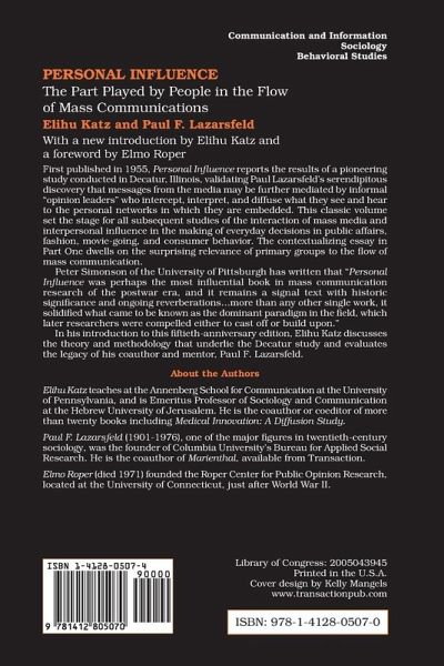 First published in 1955, "Personal Influence" reports the results of a pioneering study conducted in Decatur, Illinois, validating Paul Lazarsfeld's serendipitous discovery that messages from the media may be further mediated by informal "opinion leaders" who intercept, interpret, and diffuse what they see and hear to the personal networks in which they are embedded. This classic volume set the stage for all subsequent studies of the interaction of mass media and interpersonal influence in the making of everyday decisions in public affairs, fashion, movie-going, and consumer behavior. The contextualizing essay in Part One dwells on the surprising relevance of primary groups to the flow of mass communication. Peter Simonson of the University of Pittsburgh has written that "Personal Influence was perhaps the most influential book in mass communication research of the postwar era, and it remains a signal text with historic significance and ongoing reverberations...more than any other single work, it solidified what came to be known as the dominant paradigm in the field, which later researchers were compelled either to cast off or build upon." In his introduction to this fiftieth-anniversary edition, Elihu Katz discusses the theory and methodology that underlie the Decatur study and evaluates the legacy of his coauthor and mentor, Paul F. Lazarsfeld.