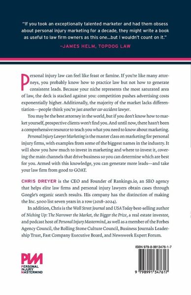 Personal injury law can feel like feast or famine. If you're like many attorneys, you probably know how to practice law but not how to generate consistent leads. Because your niche represents the most saturated area of law, the deck is stacked against you: competition pushes advertising costs exponentially higher. Additionally, the majority of the market lacks differentiation-people think you're just another car-accident lawyer. You may be the best attorney in the world, but if you don't know how to market yourself, prospective clients won't find you. And until now, there hasn't been a comprehensive resource to teach you what you need to know about marketing. Personal Injury Lawyer Marketing is the master class on marketing for personal injury firms, with examples from some of the biggest names in the industry. It will show you how much to invest in marketing and where to invest it, covering the main channels that drive business so you can determine which are best for you. Armed with this knowledge, you can generate more leads-and take your law firm from good to GOAT.