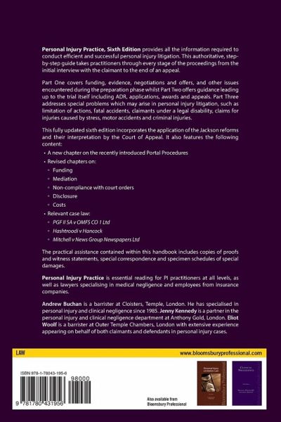 Personal Injury Practice is a step-by-step guide to personal injury litigation practice written by a highly respected team of authors. It provides everything needed to conduct efficient and successful PI litigation for claimants and sets out authoritative guidance at every stage of proceedings from first interview with a client to the end of an appeal. Written in a unique case management-led style, it approaches the subject with best practice always at the fore. Helpful specimen letters and precedents are included in the text. The new edition covers the numerous developments in the field of PI and includes new chapters on: Accidents abroad Group actions The new computer portal system for claims up to £25,000