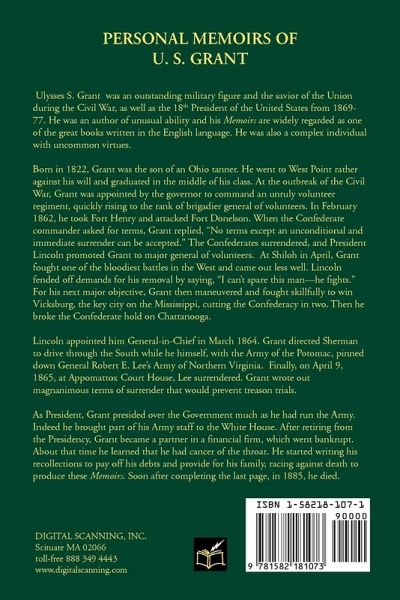 Born in 1822, Grant was the son of an Ohio tanner. He went to West Point reluctantly and graduated in the middle of his class. At the outbreak of the Civil War, Grant was appointed by the governor to command an unruly volunteer regiment, quickly rising to the rank of brigadier general of volunteers. In February 1862, he took Fort Henry and attacked Fort Donelson. When the Confederate commander asked for terms, Grant replied, No terms except an unconditional and immediate surrender can be accepted. The Confederates surrendered, and President Lincoln promoted Grant to major general of volunteers. At Shiloh in April, Grant fought one of the bloodiest battles in the West and came out less well. Lincoln fended off demands for his removal by saying, I can't spare this man he fights.' For his next major objective, Grant then maneuvered and fought skillfully to win Vicksburg, the key city on the Mississippi, cutting the Confederacy in two. Then he broke the Confederate hold on Chattanooga. Lincoln appointed him General-in-Chief in March 1864. Grant directed Sherman to drive through the South while he himself, with the Army of the Potomac, pinned down General Robert E. Lee's Army of Northern Virginia. Finally, on April 9, 1865, at Appomattox Court House, Lee surrendered. Grant wrote out magnanimous terms of surrender that would prevent treason trials. As President, Grant presided over the Government much as he had run the Army. Indeed he brought part of his Army staff to the White House. After retiring from the Presidency, Grant became a partner in a financial firm, which went bankrupt. About that time he learned that he had cancer of the throat. He started writing his recollections to pay off his debts and provide for his family, racing against death to produce these Memoirs. Soon after completing the last page, in 1885, he died. Volume 1 ISBN is 9781582181066.