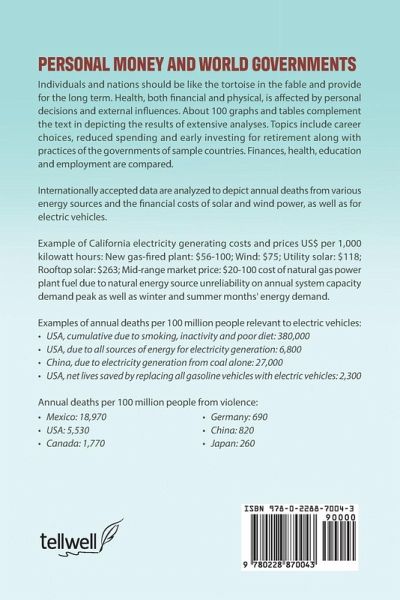 Individuals and nations should be like the tortoise in the fable and provide for the long term. Health, both financial and physical, is affected by personal decisions and external influences. About 100 graphs and tables complement the text in depicting the results of extensive analyses. Topics include career choices, reduced spending and early investing for retirement along with practices of the governments of sample countries. Finances, health, education and employment are compared. Internationally accepted data are analyzed to depict annual deaths from various energy sources and the financial costs of solar and wind power, as well as for electric vehicles. Example of California electricity generating capacity availability and costs in US$ per 1,000 kilowatt-hours: Wind 25.5% - $306; Utility Solar 27.5% - $447; Residential Solar 17.5% - $1,342. Market Value-only the $40-$100 cost of natural gas power plant fuel due to natural energy source unreliability on annual system capacity demand peak as well as winter and summer months' energy demand. Examples of annual deaths per 100 million people relevant to electric vehicles: USA, cumulative due to smoking, inactivity and poor diet: 380,000 USA, due to all sources of energy for electricity generation: 6,800 China, due to electricity generation from coal alone: 27,000 US, net lives saved by replacing all gasoline vehicles with electric vehicles: 2,300 Annual deaths per 100 million people from violence: Mexico: 18,970; USA: 5,530; Canada: 1,770; Germany: 690; China: 820; Japan: 260.