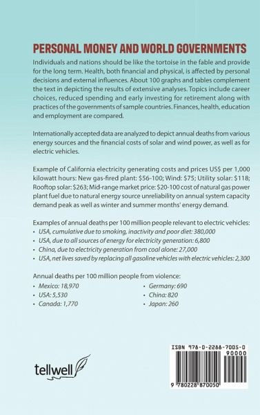 Individuals and nations should be like the tortoise in the fable and provide for the long term. Health, both financial and physical, is affected by personal decisions and external influences. About 100 graphs and tables complement the text in depicting the results of extensive analyses. Topics include career choices, reduced spending and early investing for retirement along with practices of the governments of sample countries. Finances, health, education and employment are compared. Internationally accepted data are analyzed to depict annual deaths from various energy sources and the financial costs of solar and wind power, as well as for electric vehicles. Example of California electricity generating capacity availability and costs in US$ per 1,000 kilowatt-hours: Wind 25.5% - $306; Utility Solar 27.5% - $447; Residential Solar 17.5% - $1,342. Market Value-only the $40-$100 cost of natural gas power plant fuel due to natural energy source unreliability on annual system capacity demand peak as well as winter and summer months' energy demand. Examples of annual deaths per 100 million people relevant to electric vehicles: USA, cumulative due to smoking, inactivity and poor diet: 380,000 USA, due to all sources of energy for electricity generation: 6,800 China, due to electricity generation from coal alone: 27,000 US, net lives saved by replacing all gasoline vehicles with electric vehicles: 2,300 Annual deaths per 100 million people from violence: Mexico: 18,970; USA: 5,530; Canada: 1,770; Germany: 690; China: 820; Japan: 260.
