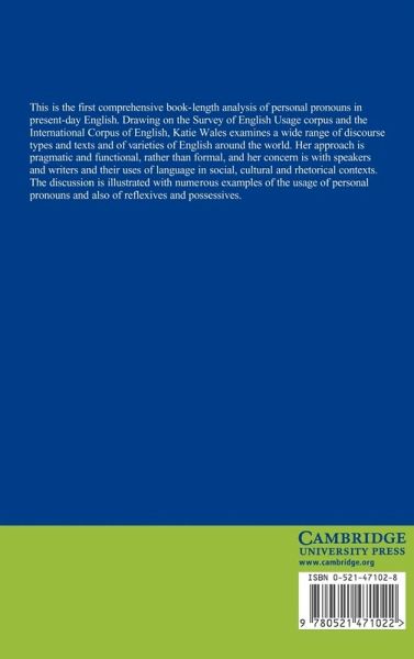 This is the first comprehensive book-length analysis of personal pronouns in present-day English. Drawing on the Survey of English (SEU) corpus and the International Corpus of English (ICE-GB), Katie Wales examines a wide range of discourse, types and texts, and of varieties of English around the world. Her approach is pragmatic and functional, rather than formal, and her concern is with speakers and writers and their uses of language in social, cultural, and rhetorical contexts. The discussion is illustrated with numerous examples of the usage of personal pronouns and also of reflexives and possessives.