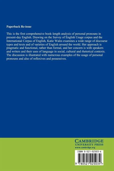This is the first comprehensive book-length analysis of personal pronouns in present-day English. Drawing on the Survey of English (SEU) corpus and the International Corpus of English (ICE-GB), Katie Wales examines a wide range of discourse, types and texts, and of varieties of English around the world. Her approach is pragmatic and functional, rather than formal, and her concern is with speakers and writers and their uses of language in social, cultural and rhetorical contexts. The discussion is illustrated with numerous examples of the usage of personal pronouns and also of reflexives and possessives.