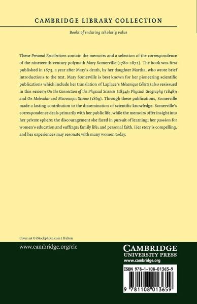 These Personal Recollections contain the memoirs and a selection of the correspondence of the nineteenth-century polymath Mary Somerville (1780-1872). The book was first published in 1873, a year after Mary's death, by her daughter Martha, who wrote brief introductions to the text. Mary Somerville is best known for her pioneering scientific publications which include her translation of Laplace's Mécanique Céleste (1831: also resissued in this series); On the Connection of the Physical Sciences (1834); Physical Geography (1848); and On Molecular and Microscopic Science (1869). Through these publications, Somerville made a lasting contribution to the dissemination of scientific knowledge. Somerville's correspondence deals primarily with her public life, while the memoirs offer insight into her private sphere: the discouragement she faced in pursuit of learning; her passion for women's education and suffrage; family life; and personal faith. Her story is compelling, and her experiences may resonate with many women today.