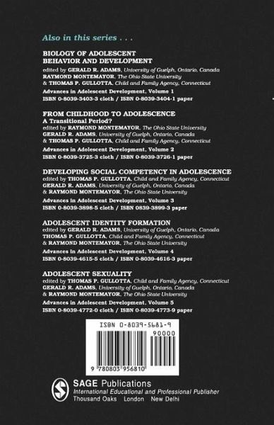 The Study of Personal Relationships During Adolescence - Raymond Montemayor Relationships During Adolescence - W Andrew Collins and Daniel J Repinski Continuity and Change in Interpersonal Perspective Relationships with Parents in Adolescence - Patricia Noller Process and Outcome Cultural Perspectives on Continuity and Change Across the Contexts of Adolescents Relationships - Catherine R Cooper `We re Popular, But We re Not Snobs - James Youniss, Jeffrey A McLellan and Darcy Strouse Adolescents Describe Their Crowds Casting Adolescent Crowds in a Relational Perspective - B Bradford Brown, Margaret S Mory and David A Kinney Caricature, Channel, and Context Romantic Views - Wyndol Furman and Elizabeth A Wehner Toward a Theory of Adolescent Romantic Relationships Dating Those You Can t Love and Loving Those You Can t Date - Ritch C Savin-Williams Adolescents Relations with Adults Outside the Family - Nancy Darling, Stephen F Hamilton and Starr Niego Current Theory and Research on Personal Relationships During Adolescence - Raymond Montemayor and Virginia R Gregg