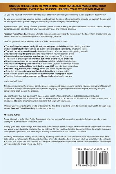 Here's a glimpse of what you'll discover inside this indispensable guide:The top 5 legal strategies to significantly reduce your tax liability 5 Essential Deductions you might be overlooking The truth about home office deductions How to handle capital gains taxes The secret to ensuring you never miss out on tax credits How to manage taxes for your small business and claim all eligible deductions Practical tips for avoiding common tax filing mistakes How to use budgeting apps and tools to streamline your tax preparation process The surprising tax benefits of contributing to an HSA How the "Buy, Borrow, Die" strategy works A simple guide to choosing between standard and itemized deductions Real-life case studies that demonstrate successful tax strategies in action NB - This is a US centric book and whilst applicable to all people does focus on US taxes