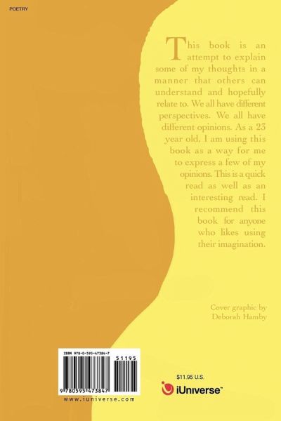 This book is an attempt to explain some of my thoughts in a manner that others can understand and hopefully relate to. We all have different perspectives. We all have different opinions. As a 23 year old, I am using this book as a way for me to express a few of my opinions. This is a quick read as well as an interesting read. I recommend this book for anyone who likes using their imagination.