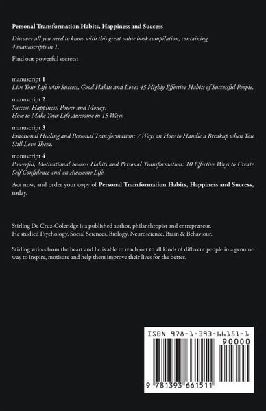 Personal Transformation Habits, Happiness and Success Discover all you need to know with this great value bumper book compilation, containing 4 manuscripts in 1. Find out powerful secrets: manuscript 1 Live Your Life with Success, Good Habits and Love: 45 Highly Effective Habits of Successful People. manuscript 2 Success, Happiness, Power and Money: How to Make Your Life Awesome in 15 Ways. manuscript 3 Emotional Healing and Personal Transformation: 7 Ways on How to Handle a Breakup when You Still Love Them. manuscript 4 Powerful, Motivational Success Habits and Personal Transformation: 10 Effective Ways to Create Self Confidence and an Awesome Life. Act now, and order your copy of Personal Transformation Habits, Happiness and Success, today.