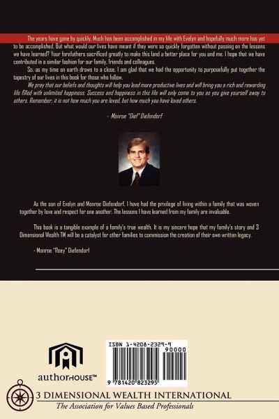 The years have gone by quickly. Much has been accomplished in my life with Evelyn and hopefully much more has yet to be accomplished. But what would our lives have meant if they were so quickly forgotten without passing on the lessons we have learned? Your forefathers sacrificed greatly to make this land a better place for you and me. I hope that we have contributed in a similar fashion for our family, friends and colleagues. So, as my time on earth draws to a close, I am glad that we had the opportunity to purposefully put together the tapestry of our lives in this book for those who follow. We pray that our beliefs and thoughts will help you lead more productive lives and will bring you a rich and rewarding life filled with unlimited happiness. Success and happiness in this life will only come to you as you give yourself away to others. Remember, it is not how much you are loved, but how much you have loved others. - Monroe "Dief" Diefendorf