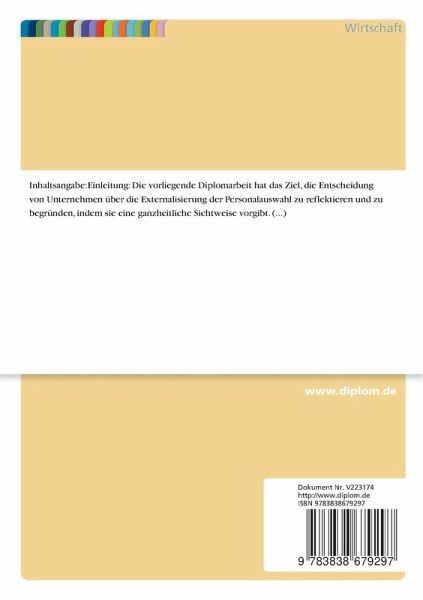 Die vorliegende Diplomarbeit hat das Ziel, die Entscheidung von Unternehmen über die Externalisierung der Personalauswahl zu reflektieren und zu begründen, indem sie eine ganzheitliche Sichtweise vorgibt. Dabei geht es nicht nur um Unternehmen, die aktuell Optimierungsbedarf bei ihrer Personalauswahl sehen, sondern auch um solche, bei denen grundsätzliche Möglichkeiten der Kostenreduktion, Leistungssteigerung oder die Konzentration auf die Kernkompetenzen im Mittelpunkt des Interesses stehen. Die Arbeit informiert über Chancen und Risiken der Externalisierung und zeigt charakteristische Problematiken und spezielle Potentiale bei der Kooperation mit den jeweiligen externen Dienstleistern auf. Der angestrebte Praxisbezug der Betrachtungen wird dadurch unterstützt, dass bei der Recherche praxisnahe Literatur im Vordergrund stand.