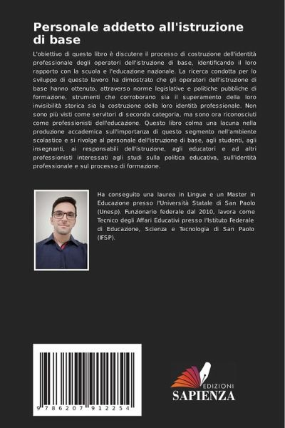 L'obiettivo di questo libro è discutere il processo di costruzione dell'identità professionale degli operatori dell'istruzione di base, identificando il loro rapporto con la scuola e l'educazione nazionale. La ricerca condotta per lo sviluppo di questo lavoro ha dimostrato che gli operatori dell'istruzione di base hanno ottenuto, attraverso norme legislative e politiche pubbliche di formazione, strumenti che corroborano sia il superamento della loro invisibilità storica sia la costruzione della loro identità professionale. Non sono più visti come servitori di seconda categoria, ma sono ora riconosciuti come professionisti dell'educazione. Questo libro colma una lacuna nella produzione accademica sull'importanza di questo segmento nell'ambiente scolastico e si rivolge al personale dell'istruzione di base, agli studenti, agli insegnanti, ai responsabili dell'istruzione, agli educatori e ad altri professionisti interessati agli studi sulla politica educativa, sull'identità professionale e sul processo di formazione.