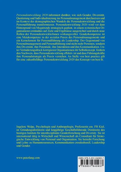Personalentwicklung 2020 informiert darüber, wie sich Gender, Diversität, Quotierung und Individualisierung im Personalmanagement durchsetzen und im Kontext des demographischen Wandels die Personalentwicklung und die Personalführung transformieren. Personalentwicklung 2020 wird vor dem Hintergrund von Megatrends strategisch geplant, in einem systemischen Organisationsverständnis auf Ziele und Ergebnisse ausgerichtet und durch neue Rollen der PersonalentwicklerInnen wirkungsvoller. Genderkompetenz ist eine Metakompetenz in der sozialen Praxis des Personalmanagements und ein Kernelement für Personalführung als Leadership. Der Gegenstand von Personalmanagement und Personalführung sind nicht mehr Personen, sondern ihre Diversität, ihre Potentiale, ihre Interaktion und ihre Kommunikation. Unter Veränderungsdruck korrigieren Organisationen ihr Selbstkonzept, fordern den Nachweis, dass Personalentwicklung effektiv ist und dass Führungskräfte ihre Personalstrategie als Praxis verstehen. An Stelle von best practice gilt für eine zukunftsfähige Personalentwicklung 2020 das Konzept von best fit.