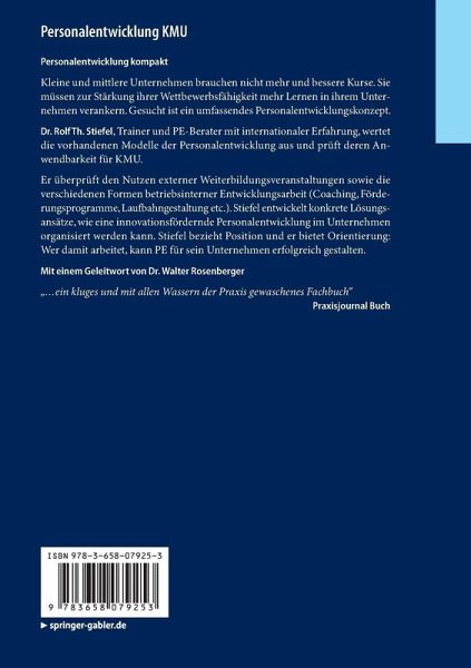 Kleine und mittlere Unternehmen brauchen nicht mehr und bessere Kurse. Sie müssen zur Stärkung ihrer Wettbewerbsfähigkeit mehr Lernen in ihrem Unternehmen verankern. Gesucht ist ein umfassendes Personalentwicklungskonzept. Dr. Rolf Th. Stiefel, Trainer und PE-Berater mit internationaler Erfahrung, wertet die vorhandenen Modelle der Personalentwicklung aus und prüft deren Anwendbarkeit für KMU. Er überprüft den Nutzen externer Weiterbildungsveranstaltungen sowie die verschiedenen Formen betriebsinterner Entwicklungsarbeit (Coaching, Förderungsprogramme, Laufbahngestaltung etc.). Stiefel entwickelt konkrete Lösungsansätze, wie eine innovationsfördernde Personalentwicklung im Unternehmen organisiert werden kann. Stiefel bezieht Position und er bietet Orientierung: wer damit arbeitet, kann PE für sein Unternehmen erfolgreich gestalten.