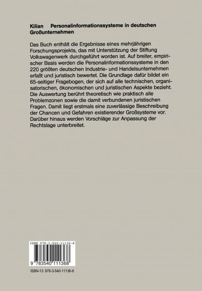1 Projektbeschreibung.- 1.1 Gegenstand des Forschungsprojekts (Kilian).- 1.2 Arbeitshypothesen (Kilian).- 1.3 Zeitlicher Ablauf (Kilian).- 1.4 Befragungsverfahren (Maschmann-Schulz).- 1.41 Die Grundgesamtheit.- 1.42 Die Befragung.- 1.421 Der standardisierte Fragebogen.- 1.422 Die Interviewsituation.- 1.423 Die schriftliche Befragung.- 1.424 Der Zeitpunkt der Befragung.- 1.5 Beschreibung der Anwendergruppe (Maschmann-Schulz).- 1.51 Zuordnung der durchgeführten Interviews zu den Rangfolgegruppen.- 1.52 Anteil der konzernverbundenen Unternehmen.- 1.53 Beschreibung der Anwender nach dem Merkmal "Umsatzgrößengruppe".- 1.54 Anzahl der beschäftigten Arbeitnehmer.- 1.55 Verteilung der implementierten computergestützten Personalinformationssysteme nach dem Kriterium "Anzahl der Beschäftigten im Personalbereich".- 1.56 Verteilung der implementierten automatisierten Personalinformationssysteme nach dem Beschreibungsmerkmal "Tarifzugehörigkeit/Branche".- 1.6 Datenschutz innerhalb des Forschungsprojekts (Heissner/Maschmann-Schulz).- 1.61 Art der erhobenen Daten.- 1.62 Datenschutzregelungen für die empirische Forschung.- 1.63 Datenschutzverpflichtungen für das Forschungsprojekt.- 1.64 Konkrete Maßnahmen zur Erfüllung der Verpflichtungen.- 2 Allgemeine Beschreibung existierender Personalinformationssysteme in Großunternehmen (Maschmann-Schulz).- 2.1 Methodische Vorgehensweise.- 2.2 Zum Aufbau von Personalinformationssystemen.- 2.21 Ableitung der Anforderungen an computergestützte Personalinformationssysteme.- 2.22 Empirische Ergebnisse zu den Einführungsgründen und Zielsetzungen.- 2.221 Die Einführungsgründe.- 2.222 Zielsetzungen.- 2.223 Selbstentwicklung oder Programmsystem-Kauf.- 2.3 Der Entwicklungsstand bestehender Personalinformationssysteme.- 3Theoretisches Konzept zur Bewertung von Personalinformationen (Kilian).- 3.1 Bedeutung automatisierter Personalinformationen.- 3.2 ökonomische und rechtliche Klassifikation von Personalinformationen.- 3.3 Chancen und Gefahren der Verwendung von Personalinformationen oder: Das Problem der optimalen Allokation von Personalinformationen.- 3.4 Bewertungsgesichtspunkte.- 4 Informationsflüsse.- 4.1 Problemstellung (Maschmann-Schulz/Kilian).- 4.2 Datenquellen (Heissner/Maschmann-Schulz/Kilian).- 4.21 Untersuchungsergebnisse.- 4.211 Interne Datenquellen.- 4.212 Externe Datenquellen.- 4.22 Bewertung.- 4.3 Zugriffsregelungen für den unternehmensinternen Informationsfluß (Maschmann-Schulz/Kilian).- 4.31 Untersuchungsergebnisse.- 4.32 Bewertung.- 4.4 Übermittlung von Personaldaten an Dritte im In- und Ausland (Maschmann-Schulz/Kilian).- 4.41 Untersuchungsergebnisse zur Informationsübermittlung im Inland.- 4.42 Untersuchungsergebnisse zur Informationsübermittlung ins Ausland.- 4.43 Bewertung.- 4.5 Konzerndatenverarbeitung (Kilian).- 4.51 Untersuchungsergebnisse.- 4.52 Bewertung.- 4.521 Verarbeitung von Personaldaten durch die Muttergesellschaft im Auftrag der Tochtergesellschaft.- 4.522 Gemeinsame Verarbeitung von Personaldaten konzernverbundener Unternehmen.- 4.6 Vorschläge (Kilian).- 5 Arbeitsmedizinisches System (Kilian).- 5.1 Überblick über die Fragestellung.- 5.2 Das Arbeitssicherheitsgesetz.- 5.3 Rechtsvorschriften im Hinblick auf bestimmte Arbeitnehmergruppen.- 5.4 Rechtsvorschriften im Hinblick auf bestimmte Tätigkeiten oder Krankheiten.- 5.5 Rechtsvorschriften über Dokumentations-, Auskunfts- und Meldepflichten.- 5.6 Empirischer Befund.- 5.61 Rechnergestützte Funktionen des Betriebsarztes.- 5.62 Ermittlung arbeitsmedizinischer Daten.- 5.63 Dokumentationarbeitsmedizinischer Daten.- 5.64 Weitergabe arbeitsmedizinischer Daten im Unternehmen.- 5.65 Verwendung arbeitsmedizinischer Daten im Unternehmen.- 5.66 Zugriff auf arbeitsmedizinische Daten im Personalinformationssystem.- 5.7 Rechtliche Bewertung des empirischen Befundes.- 5.71 Stellung des Betriebsarztes.- 5.72 Zulässige Formen der Verarbeitung arbeitsmedizinischer Daten.- 6.721 Mitteilung von Untersuchungsergebnissen.- 5.722 Anfragen der Personalabteilung.- 5.723 Mitteilung über verbotene Arbeiten für Jugendliche.- 5.73 Unzulässige Formen der Verarbeitung arbeitsmedizinischer Daten.- 5.731 Weitergabe von Befund-, Diagnose- oder Therapiedaten.- 5.732 Weitergabe von Versichertendaten.- 5.8 Prognose über die künftige Entwicklung.- 5.9 Vorschläge für gesetzliche Neuregelungen im Bereich arbeitsmedizinischer Daten.- 5.91 Änderungen des Arbeitssicherheitsgesetzes.- 5.92 Änderungen des Jugendarbeitsschutzgesetzes.- 5.93 Änderungen der Arbeitsstoffverordnung.- 5.94 Änderungen des Betriebsverfassungsgesetzes.- 5.95 Änderung des Sozialgesetzbuchs.- 5.96 Änderung des Arbeitsförderungsgesetzes.- 6 Datenprofile (Maschmann-Schulz/Kilian).- 6.1 Darstellung des Profilverfahrens.- 6.2 Untersuchungsergebnisse zur Verbreitung von Profilsystemen.- 6.3 Chancen und Gefahren von Profilverfahren.- 6.4 Insbesondere: Leistungsbeurteilung als Element des Fähigkeitsprofils.- 6.41 Gegenstand der Leistungsbeurteilung.- 6.42 Untersuchungsergebnisse zur Leistungsbeurteilung.- 6.5 Bewertung der Ergebnisse.- 6.6 Reformvorschläge.- 7 Betriebsjustiz (Kilian).- 7.1 Untersuchungsergebnisse.- 7.2 Bewertung.- 7.3 Vorschläge.- 8 Leiharbeitnehmer (Kilian).- 8.1 Empirischer Befund.- 8.2 Rechtliche Bewertung.- 9 Beteiligung des Arbeitnehmers an der Verarbeitung von Personaldaten (Kilian).-9.1 Einsichtnahmerecht/Auskunftsrecht des Arbeitnehmers.- 9.11 Problem der Vergleichbarkeit von Personalakte und Personalinformationssystem.- 9.12 Verfahren bei der Einsichtnahme bei Personalinformationssystemen.- 9.13 Zweck der Einsichtnahme.- 9.14 Kosten der Einsichtnahme.- 9.2 Benachrichtigungspflicht des Arbeitgebers.- 9.21 26 Abs. 1 BDSG.- 9.22 Inhalt der Benachrichtigung.- 9.23 Form der Benachrichtigung.- 9.24 Grenzen der Benachrichtigung.- 9.241 Gesundheitsdaten.- 9.242 Planungsdaten.- 9.243 Beurteilungsdaten.- 9.3 Recht des Arbeitnehmers zur Abgabe von Gegenerklärungen.- 9.4 Vorschläge für eine gesetzliche Neu