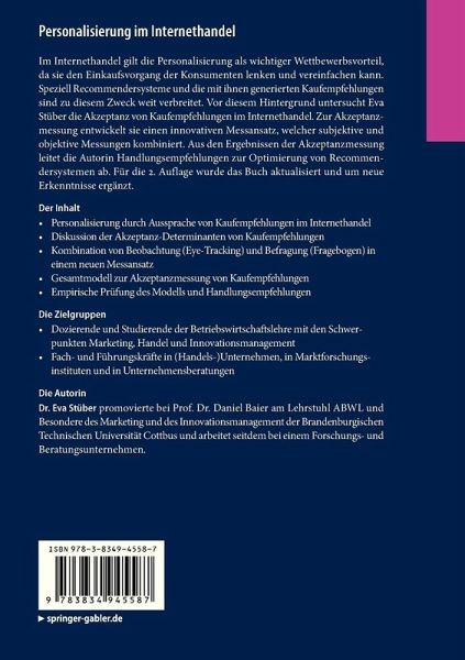 Im Internethandel gilt die Personalisierung als wichtiger Wettbewerbsvorteil, da sie den Einkaufsvorgang der Konsumenten lenken und vereinfachen kann. Speziell Recommendersysteme und die mit ihnen generierten Kaufempfehlungen sind zu diesem Zweck weit verbreitet. Vor diesem Hintergrund untersucht Eva Stüber die Akzeptanz von Kaufempfehlungen im Internethandel. Zur Akzeptanzmessung entwickelt sie einen innovativen Messansatz, welcher subjektive und objektive Messungen kombiniert. Aus den Ergebnissen der Akzeptanzmessung leitet die Autorin Handlungsempfehlungen zur Optimierung von Recommendersystemen ab.