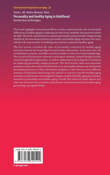 This book highlights international efforts to better understand the role of individual differences in healthy aging by exploring new directions, methods, and questions within the field. The book considers how to measure personality and personality change during adulthood, the associations between personality and healthy aging outcomes over time, and the role of personality in building interventions to promote healthy aging.