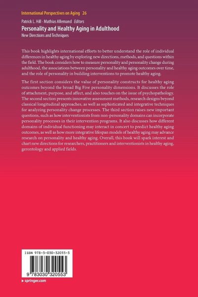 This book highlights international efforts to better understand the role of individual differences in healthy aging by exploring new directions, methods, and questions within the field. The book considers how to measure personality and personality change during adulthood, the associations between personality and healthy aging outcomes over time, and the role of personality in building interventions to promote healthy aging.