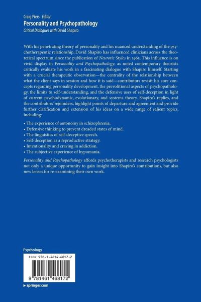 Personality and Psychopathology: Critical Dialogues with David Shapiro, ably edited by Craig Piers, provides a comprehensive understanding of his influence. By having Shapiro engage individually in exchanges with a roster of distinguished psychologists and psychoanalysts-researchers and clinicians alike-Piers captures the scope and boundaries of his perspective. Shapiro's interlocutors-Herbert J. Schlesinger, Paul L. Wachtel, E. Virginia Demos, Sidney J. Blatt, Louis A. Sass, Morris N. Eagle, Mardi J. Horowitz, Michael F. Schober and Peter J. Glick, Lawrence Josephs, Craig Piers, Mindy Greenstein, and Andreas Evdokas and Ali Khadivi-bring their unique perspectives to bear on Shapiro's work. A noteworthy feature of this volume, which takes it beyond a simple collection of articles, is its emphasis on dialogue. From genuine dialogue comes new understanding; this volume articulates a complex theory of personality and psychopathology, and it is peppered with clinical wisdom about the therapeutic process...It is a unique and creative approach to personality andpsychopathology, authored by a fiercely independent and acutely perceptive clinical psychologist.