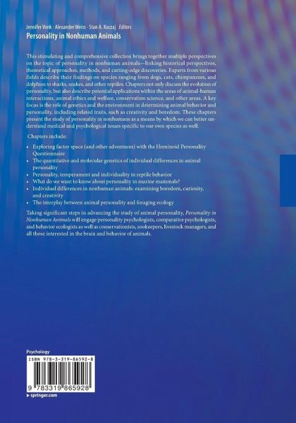 This stimulating and comprehensive collection brings together multiple perspectives on the topic of personality in nonhuman animals-linking historical perspectives, theoretical approaches, methods, and cutting-edge discoveries. Experts from various fields describe their findings on species ranging from dogs, cats, chimpanzees, and dolphins to sharks, snakes, and other reptiles. Chapters not only discuss the evolution of personality, but also describe potential applications within the areas of animal-human interactions, animal ethics and welfare, conservation science, and other areas. A key focus is the role of genetics and the environment in determining animal behavior and personality, including related traits, such as creativity and boredom. These chapters present the study of personality in nonhumans as a means by which we can better understand medical and psychological issues specific to our own species as well.