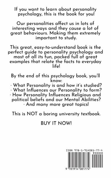 If you want to learn about personality psychology, this is the book for you! Our personalities affect us in lots of interesting ways and they cause a lot of great behaviours. Making them extremely important to study. This great, easy-to-understand book is the perfect guide to personality psychology and most of all its fun, packed full of great examples that relate the facts to everyday life!What Personality is and how it's studied? What Influences our Personality to form? How Personality Influences Religious and political beliefs and our Mental Abilities? And many more great topics! This is NOT a boring university textbook. BUY IT NOW! Personality Psychology Content Introduction Fun Personality Notes Part One: Introduction to Personality Psychology Introduction to Personality Classifying Traits, Eysenck and The Lexical Approach to Personality Five Factor Model of Personality and 'The Big Five' HEXACO Model of Personality Part Two: The Biological Basis, Genetic and Environmental influences on Personality and Development and Stability of Personality Biological basis of Personality: The Ancient, Modern and Neurotransmitters Gray's Theory, Eysenck's Theory and the Evidence Personality and Hormones Developmental Changes and Stability of Personality Introduction to Genetic and Environmental Influences on Personality Genetic and Environmental Influences on Personality Effects of Unique and Shared Environments and The Difficulties of Inheritability Part Three: Personality and Mental Abilities Introduction and Theories of Intelligence Biological Basis, Genetic and Environmental Influences on Intelligence Mental Ability and Life Outcomes Developmental Changes and Stability of Intelligence Fluid Intelligence, Crystallised Intelligence and The Flynn Effect Alternative Theories of Intelligence Emotional Intelligence Part Four: Religiosity and Political Attitudes in Personality Psychology Introduction to Religiosity in Personality and Religiosity and Personality Dimensions Change and Stability of Religiosity and Religiosity and Life Outcomes Introduction to Politics and Personality Right-Wing Authoritarianism and Social Dominance Orientation Dual Process Model of Ideologies and Prejudice, Attitudes and Personality, and Attitudes and Behaviours Towards Non-Human Outgroups Part Five: Personality and Life Outcomes Personality and Social Life Outcomes Personality, Self-Control, The Dark Triad and Other Life Outcomes Personality, Health Related outcomes and Academic Achievement
