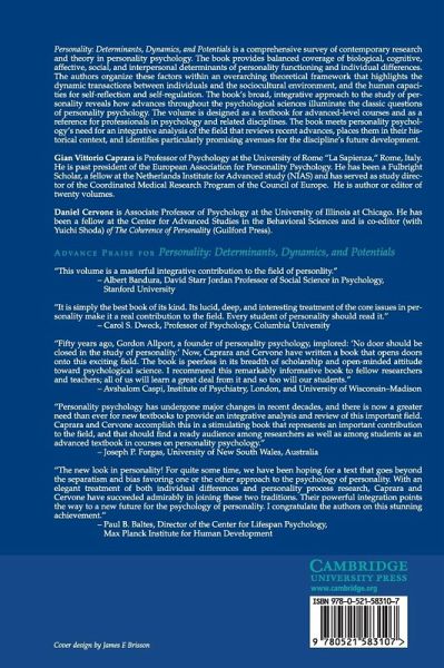 Personality: Determinants, Dynamics and Potentials, first published in 2000, is a comprehensive survey of research and theory in personality psychology. The book provides balanced coverage of biological, cognitive, affective, social, and interpersonal determinants of personality functioning and individual differences. The authors organize these factors within an overarching theoretical framework that highlights the dynamic transactions between individuals and the sociocultural environment, and the human capacities for self-reflection and self-regulation. The book's broad, integrative approach to the study of personality reveals how advances throughout the psychological sciences illuminate the classic questions of personality psychology. The volume is designed as a textbook for advanced-level courses and as a reference for professionals in psychology and related disciplines. The book meets personality psychology's need for an integrative analysis of the field that reviews recent advances, places them in their historical context, and identifies particularly promising avenues for the discipline's future development.