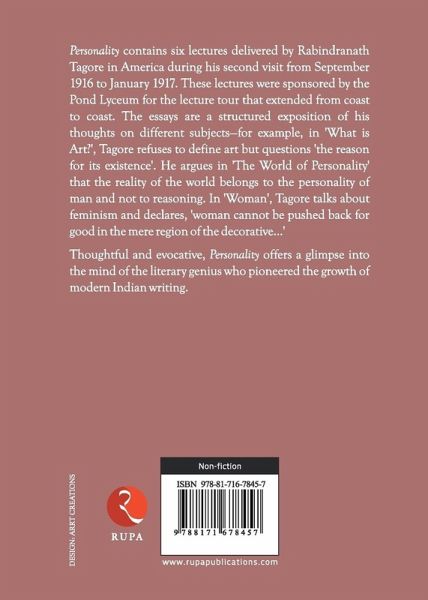 Personality (1917) contains six lectures delivered in America during Tagore's second visit there. The essays are a structured exposition of his thoughts on different subjects like 'Art', 'Reason for its Existence', 'Woman' and so on.