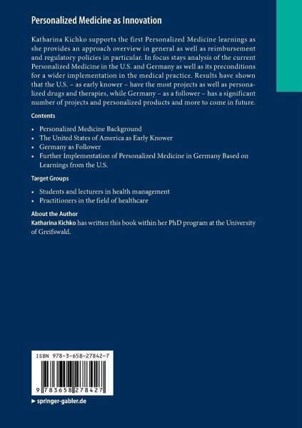 Katharina Kichko supports the first Personalized Medicine learnings as she provides an approach overview in general as well as reimbursement and regulatory policies in particular. In focus stays analysis of the current Personalized Medicine in the U.S. and Germany as well as its preconditions for a wider implementation in the medical practice. Results have shown that the U.S. - as early knower - have the most projects as well as personalized drugs and therapies, while Germany - as a follower - has a significant number of projects and personalized products and more to come in future.