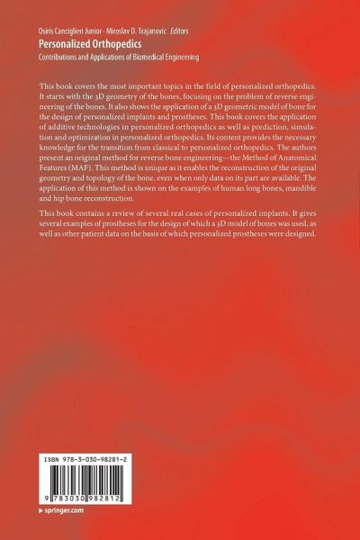 This book covers the most important topics in the field of personalized orthopedics. It starts with the 3D geometry of the bones, focusing on the problem of reverse engineering of the bones. It also shows the application of a 3D geometric model of bone for the design of personalized implants and prostheses. This book covers the application of additive technologies in personalized orthopedics as well as prediction, simulation and optimization in personalized orthopedics. Its content provides the necessary knowledge for the transition from classical to personalized orthopedics. The authors present an original method for reverse bone engineering-the Method of Anatomical Features (MAF). This method is unique as it enables the reconstruction of the original geometry and topology of the bone, even when only data on its part are available. The application of this method is shown on the examples of human long bones, mandible and hip bone reconstruction.