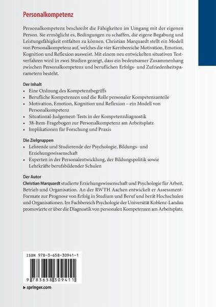 Personalkompetenz beschreibt die Fähigkeiten im Umgang mit der eigenen Person. Sie ermöglicht es, Bedingungen zu schaffen, die eigene Begabung und Leistungsfähigkeit entfalten zu können. Christian Marquardt stellt ein Modell von Personalkompetenz auf, welches die vier Kernbereiche Motivation, Emotion, Kognition und Reflexion ausweist. Mit einem neu entwickelten situativen Testverfahren wird in zwei Studien gezeigt, dass ein bedeutsamer Zusammenhang zwischen Personalkompetenz und beruflichen Erfolgs- und Zufriedenheitsparametern besteht.