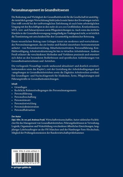 Einen wesentlichen Beitrag zum Gelingen leistet ein modernes und wertschätzendes Personalmanagement, das ein breites Instrumentarium anbietet: Personalentwicklung, Mitarbeitermotivation, Personalführung, Konfliktbewältigung, Arbeitsstrukturierung, bis hin zu virtuellen Arbeitsformen. Andreas Frodl erläutert mit Hilfe von zahlreichen Beispielen die verschiedenen Methoden und Verfahren praxisnah und orientiert an den besonderen Bedürfnissen Gesundheitsunternehmen und -betrieben.
