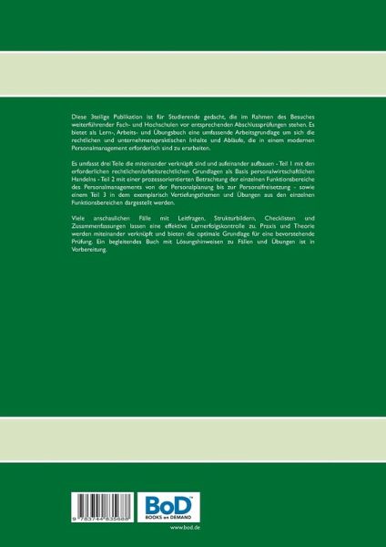 Diese 3teilige Publikation ist für Studierende gedacht, die im Rahmen des Besuches weiterführender Fach- und Hochschulen vor entsprechenden Abschlussprüfungen stehen. Es bietet als Lern-, Arbeits- und Übungsbuch eine umfassende Arbeitsgrundlage um sich die rechtlichen und unternehmenspraktischen Inhalte und Abläufe, die in einem modernen Personalmanagement erforderlich sind zu erarbeiten.Es umfasst drei Teile die miteinander verknüpft sind und aufeinander aufbauen - Teil 1 mit den erforderlichen rechtlichen/arbeitsrechtlichen Grundlagen als Basis personalwirtschaftlichen Handelns - Teil 2 mit einer prozessorientierten Betrachtung der einzelnen Funktionsbereiche des Personalmanagements von der Personalplanung bis zur Personalfreisetzung - sowie Teil 3 in dem exemplarisch Vertiefungsthemen und Übungen aus den einzelnen Funktionsbereichen dargestellt werden.Viele anschauliche Fälle mit Leitfragen, Strukturbildern, Checklisten und Zusammenfassungen lassen eine effektive Lernerfolgskontrolle zu. Praxis und Theorie werden miteinander verknüpft und bieten die optimale Grundlage für eine bevorstehende Prüfung. Ein begleitendes Buch mit Lösungshinweisen zu Fällen und Übungen ist in Vorbereitung.