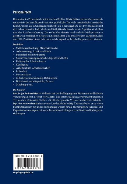 Prof. Dr. jur. Andreas Wien ist Volljurist mit der Befähigung zum Richteramt und höheren Verwaltungsdienst. Er lehrt Wirtschafts- und Internetrecht an der Brandenburgischen Technischen Universität Cottbus - Senftenberg und ist Verfasser mehrerer Lehrbücher. Dipl.-Bw. Normen Franzke ist an einer Landesbehörde tätig. Zudem arbeitet er an vielen Fachpublikationen mit und ist selbständiger Dozent für die Themengebiete Personal- und Organisationsmanagement sowie Personalcontrolling an verschiedenen Bildungseinrichtungen.