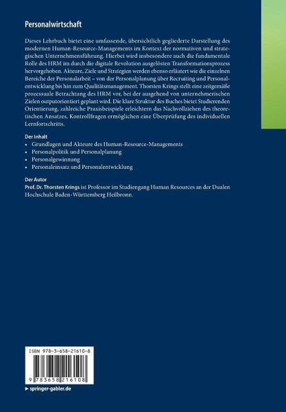 Dieses Lehrbuch bietet eine umfassende, übersichtlich gegliederte Darstellung des modernen Human-Resource-Managements im Kontext der normativen und strategischen Unternehmensführung. Hierbei wird insbesondere auch die fundamentale Rolle des HRM im durch die digitale Revolution ausgelösten Transformationsprozess hervorgehoben. Akteure, Ziele und Strategien werden ebenso erläutert wie die einzelnen Bereiche der Personalarbeit - von der Personalplanung über Recruiting und Personalentwicklung bis hin zum Qualitätsmanagement. Thorsten Krings stellt eine zeitgemäße prozessuale Betrachtung des HRM vor, bei der ausgehend von unternehmerischen Zielen outputorientiert geplant wird. Die klare Struktur des Buches bietet Studierenden Orientierung, zahlreiche Praxisbeispiele erleichtern das Nachvollziehen des theoretischen Ansatzes, Kontrollfragen ermöglichen eine Überprüfung des individuellen Lernfortschritts.