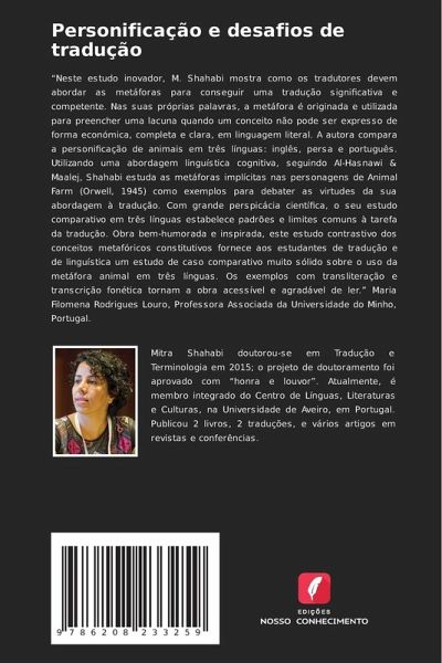 "Neste estudo inovador, M. Shahabi mostra como os tradutores devem abordar as metáforas para conseguir uma tradução significativa e competente. Nas suas próprias palavras, a metáfora é originada e utilizada para preencher uma lacuna quando um conceito não pode ser expresso de forma económica, completa e clara, em linguagem literal. A autora compara a personificação de animais em três línguas: inglês, persa e português. Utilizando uma abordagem linguística cognitiva, seguindo Al-Hasnawi & Maalej, Shahabi estuda as metáforas implícitas nas personagens de Animal Farm (Orwell, 1945) como exemplos para debater as virtudes da sua abordagem à tradução. Com grande perspicácia científica, o seu estudo comparativo em três línguas estabelece padrões e limites comuns à tarefa da tradução. Obra bem-humorada e inspirada, este estudo contrastivo dos conceitos metafóricos constitutivos fornece aos estudantes de tradução e de linguística um estudo de caso comparativo muito sólido sobre o uso da metáfora animal em três línguas. Os exemplos com transliteração e transcrição fonética tornam a obra acessível e agradável de ler." Maria Filomena Rodrigues Louro, Professora Associada da Universidade do Minho, Portugal.