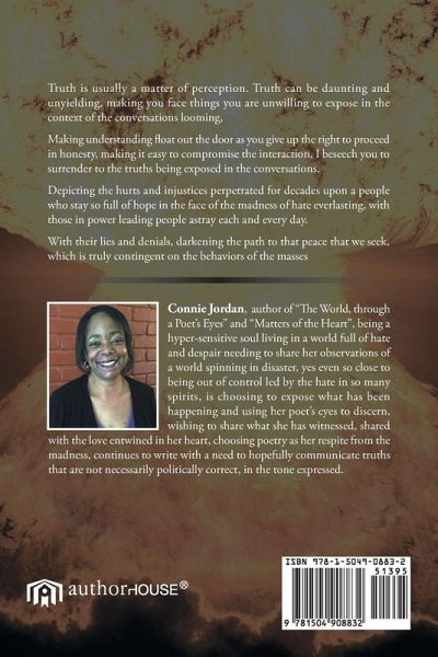 Connie Jordan, author of "The World, through a Poet's Eyes" and "Matters of the Heart", being a hyper-sensitive soul living in a world full of hate and despair needing to share her observations of a world spinning in disaster, yes even so close to being out of control led by the hate in so many spirits, is choosing to expose what has been happening and using her poet's eyes to discern, wishing to share what she has witnessed, shared with the love entwined in her heart, choosing poetry as her respite from the madness, continues to write with a need to hopefully communicate truths that are not necessarily politically correct, in the tone expressed.