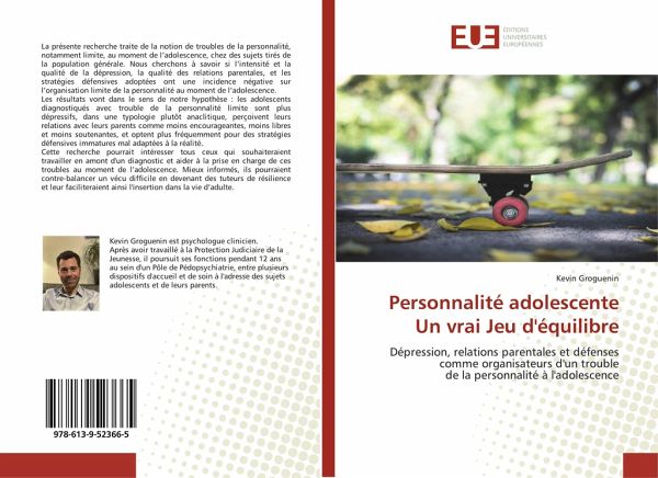 La présente recherche traite de la notion de troubles de la personnalité, notamment limite, au moment de l'adolescence, chez des sujets tirés de la population générale. Nous cherchons à savoir si l'intensité et la qualité de la dépression, la qualité des relations parentales, et les stratégies défensives adoptées ont une incidence négative sur l'organisation limite de la personnalité au moment de l'adolescence.Les résultats vont dans le sens de notre hypothèse : les adolescents diagnostiqués avec trouble de la personnalité limite sont plus dépressifs, dans une typologie plutôt anaclitique, perçoivent leurs relations avec leurs parents comme moins encourageantes, moins libres et moins soutenantes, et optent plus fréquemment pour des stratégies défensives immatures mal adaptées à la réalité.Cette recherche pourrait intéresser tous ceux qui souhaiteraient travailler en amont d'un diagnostic et aider à la prise en charge de ces troubles au moment de l'adolescence. Mieux informés, ils pourraient contre-balancer un vécu difficile en devenant des tuteurs de résilience et leur faciliteraient ainsi l'insertion dans la vie d'adulte.