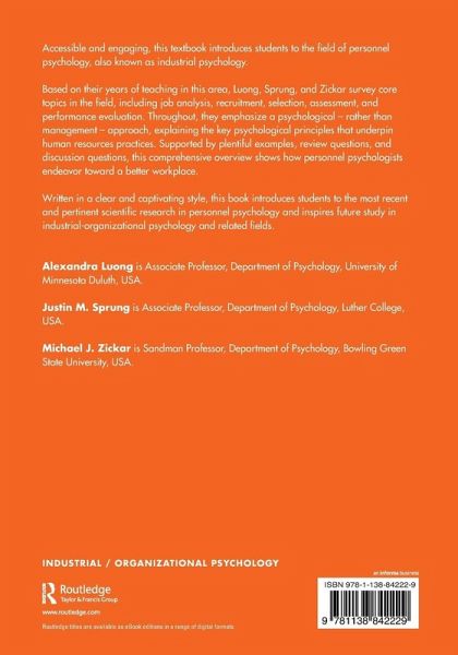 Based on their years of teaching in this area, Luong, Sprung, and Zickar survey core topics in the field, including job analysis, recruitment, selection, assessment, and performance evaluation. Throughout, they emphasize a psychological - rather than management - approach, explaining the key psychological principles that underpin human resources practices. Supported by plentiful examples, review questions, and discussion questions, this comprehensive overview shows how personnel psychologists endeavor toward a better workplace.