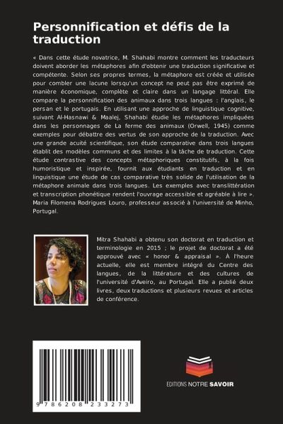 « Dans cette étude novatrice, M. Shahabi montre comment les traducteurs doivent aborder les métaphores afin d'obtenir une traduction significative et compétente. Selon ses propres termes, la métaphore est créée et utilisée pour combler une lacune lorsqu'un concept ne peut pas être exprimé de manière économique, complète et claire dans un langage littéral. Elle compare la personnification des animaux dans trois langues : l'anglais, le persan et le portugais. En utilisant une approche de linguistique cognitive, suivant Al-Hasnawi & Maalej, Shahabi étudie les métaphores impliquées dans les personnages de La ferme des animaux (Orwell, 1945) comme exemples pour débattre des vertus de son approche de la traduction. Avec une grande acuité scientifique, son étude comparative dans trois langues établit des modèles communs et des limites à la tâche de traduction. Cette étude contrastive des concepts métaphoriques constitutifs, à la fois humoristique et inspirée, fournit aux étudiants en traduction et en linguistique une étude de cas comparative très solide de l'utilisation de la métaphore animale dans trois langues. Les exemples avec translittération et transcription phonétique rendent l'ouvrage accessible et agréable à lire ». Maria Filomena Rodrigues Louro, professeur associé à l'université de Minho, Portugal.