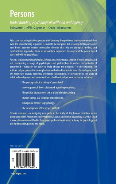 Persons: Understanding Psychological Selfhood and Agency recasts theories of mind, behavior, and self, synthesizing a range of psychologists and philosophers to restore the centrality of personhood-especially the ability to make choices and decisions-to the discipline. The authors' unique perspective de-emphasizes method and formula in favor of moral agency and life experience, reveals frequently overlooked contributions of psychology to the study of individuals and groups, and traces traditions of selfhood and personhood theory, including: The pre-psychological history of personhood, a developmental theory of situated, agentive personhood, the political disposition of self as a kind of understanding, Human agency as a condition of personhood, Emergentist theories in psychology, the development of the perspectival self.
