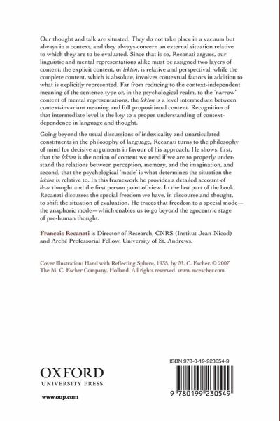 Francois Recanati presents a ground-breaking study of the context-dependence of our language and thought. He argues that our linguistic and mental representations alike must be assigned two layers of content: the explicit content, which is relative and perspectival, and the complete content, which is absolute and involves contextual factors.