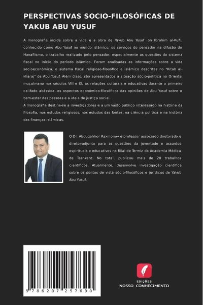 A monografia incide sobre a vida e a obra de Yakub Abu Yusuf ibn Ibrahim al-Kufi, conhecido como Abu Yusuf no mundo islâmico, os serviços do pensador na difusão do Hanafiismo, o trabalho realizado pelo pensador, especialmente as questões do sistema fiscal no início do período islâmico. Foram analisadas as informações sobre a vida socioeconómica, o sistema fiscal religioso-filosófico e islâmico descritas no "Kitab al-kharaj" de Abu Yusuf. Além disso, são apresentados a situação sócio-política no Oriente muçulmano nos séculos VIII e IX, as relações culturais e educativas durante o primeiro califado abássida, os aspectos económico-filosóficos das opiniões de Abu Yusuf sobre o bem-estar das pessoas e a ideia de justiça social.A monografia destina-se a investigadores e a um vasto público interessado na história da filosofia, nos estudos religiosos, nos estudos das fontes, na ciência política e na história das finanças islâmicas.