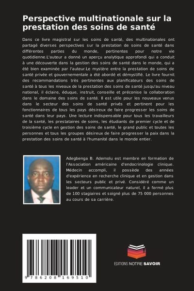 Dans ce livre magistral sur les soins de santé, des multinationales ont partagé diverses perspectives sur la prestation de soins de santé dans différentes parties du monde, pertinentes pour notre vie quotidienne.L'auteur a donné un aperçu analytique approfondi qui a conduit à une découverte dans la gestion des soins de santé dans le monde, qui a été bien examinée par l'auteur.Le mystère entre la prestation de soins de santé privée et gouvernementale a été abordé et démystifié. Le livre fournit des recommandations très pertinentes aux planificateurs des soins de santé à tous les niveaux de la prestation des soins de santé jusqu'au niveau national, il éclaire, éduque, instruit, conseille et préconise la collaboration dans le domaine des soins de santé. Il est utile pour les nouveaux venus dans le secteur des soins de santé privés et pertinent pour les fonctionnaires de tous les pays désireux de faire progresser les soins de santé dans leur pays. Une lecture indispensable pour tous les travailleurs de la santé, les prestataires de soins, les étudiants de premier cycle et de troisième cycle en gestion des soins de santé, le grand public et toutes les personnes et tous les groupes désireux de faire progresser la paix dans la prestation des soins de santé à l'humanité dans le monde entier.