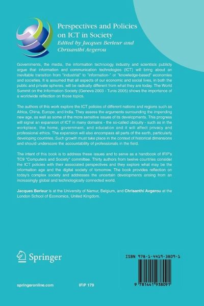 Perspectives and Policies on ICT in Society explores the ICT policies of different nations and regions such as Africa, China, Europe, and India. The authors assess the arguments surrounding the impending new age, as well as some of the more sensitive issues of its developments. This progress will signal an expansion of ICT in many domains - the so-called ubiquity - such as in the workplace, the home, government, and education and it will affect privacy and professional ethics. The expansion will also encompass all parts of the earth, particularly developing countries. Such growth must take place in the context of historical dimensions and should underscore the accountability of professionals in the field.